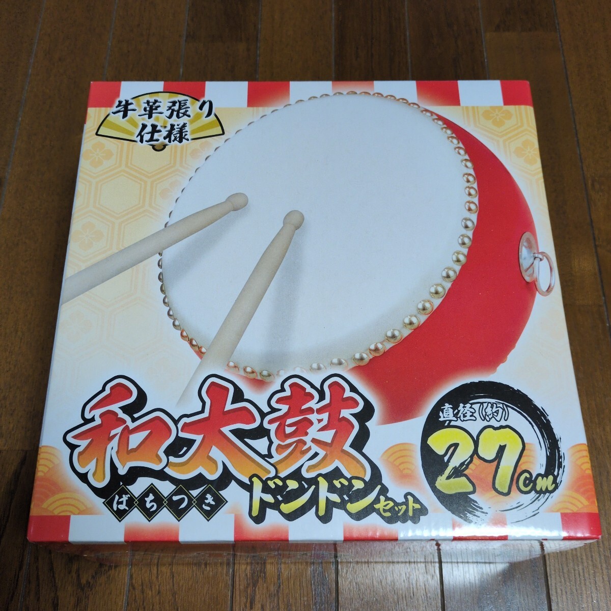 - 和太鼓 ばちつき ドンドンセット 直径約27センチ 牛革張り仕様 新品 未使用 キズあり 箱付き