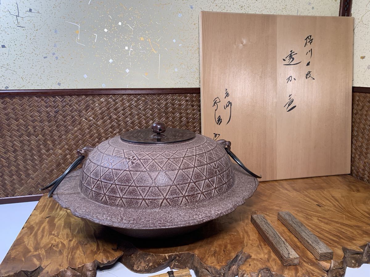 - 【茶道具】釜師 人間国宝 佐藤浄清 作 桜川地紋 透木釜 在銘 共箱 釜環 透木付 銅蓋 鉄釜 風炉釜 茶釜 良品 骨董 古玩 同梱相談可 煎茶器