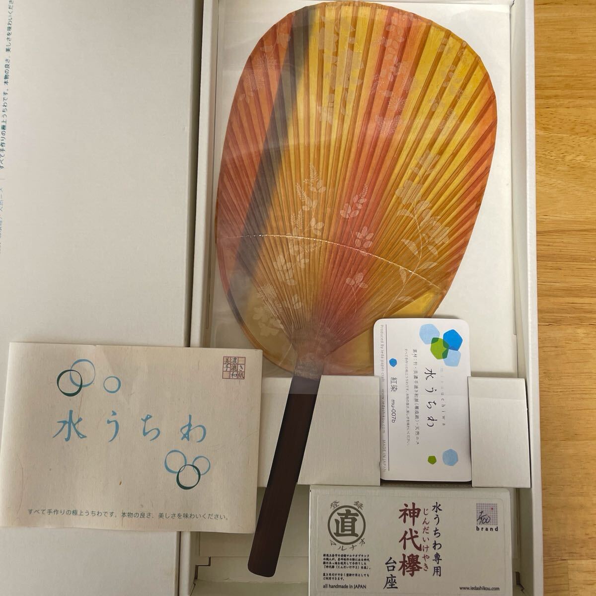 - 未使用に近い!美濃和紙 水うちわ 小判型 紅染 箱入り 家田紙工 美濃手漉き和紙 雁皮紙 竹 極上うちわ 日本製 和装小物 台座付き
