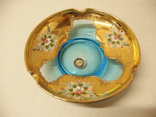 > 0850128w【イタリア製 MURANO GLASS 灰皿】24KT GOLD PAINT/ムラーノ/クリアブルー×ゴールド/花柄/アッシュトレイ/中古品
