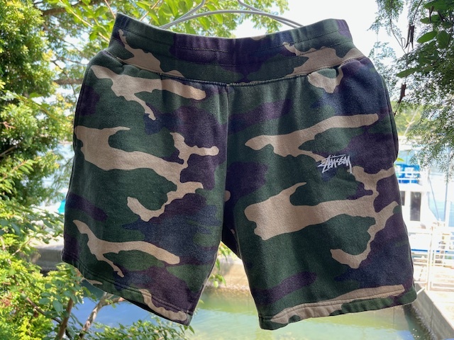 > STUSSY カモフラ 迷彩 ハーフパンツ ショートパンツ スウエットパンツ Sサイズ ユーズド スウエットハーフパンツ ステューシー