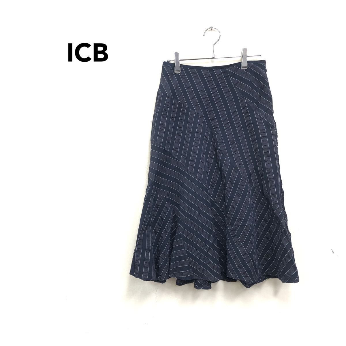 > 2H2033-Y◆ICB アイシービー フレアロングスカート 切り替えデザイン ストライプ ボーダー リネンブレンド レディース◆size9 ネイビー 綿