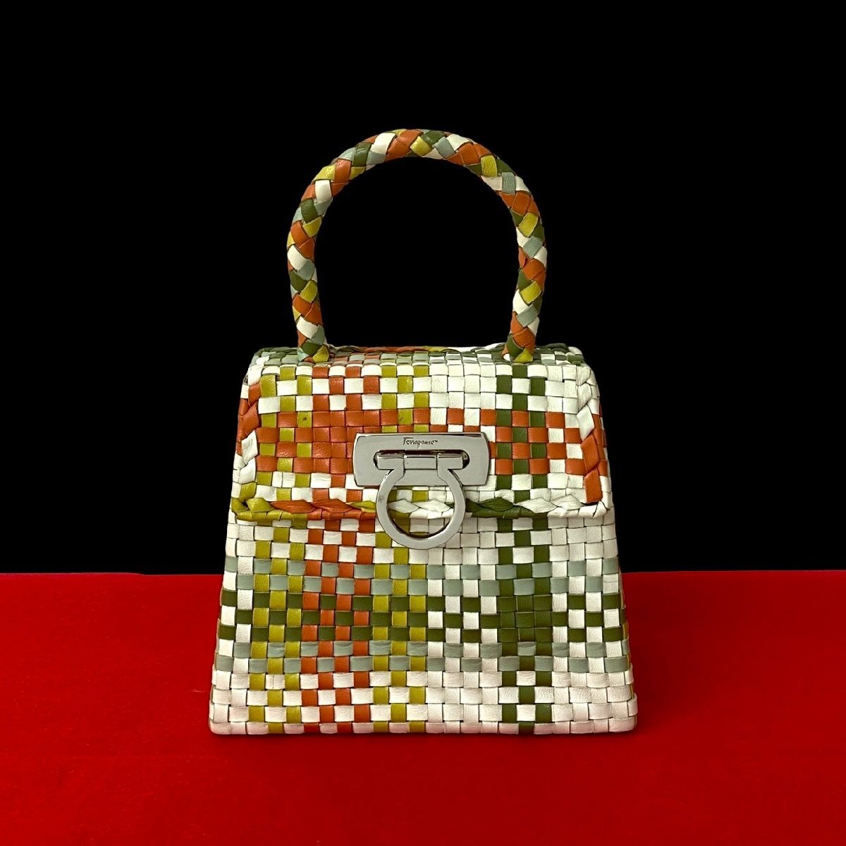 - 極 美品 Salvatore Ferragamo サルヴァトーレフェラガモ ガンチーニ ロゴ 金具 レザー 本革 ハンドバッグ オレンジ マルチカラー 46349