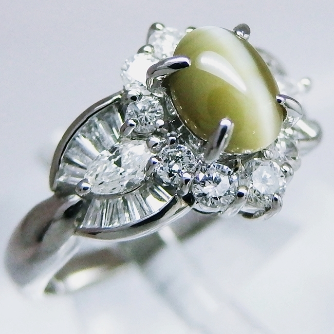 > Pt900★リング クリソベリルキャッツアイ1.20ct◇ダイヤ0.85ct●11号◆鑑別書付き【中古】【TAKEICHI】”27023/10009934