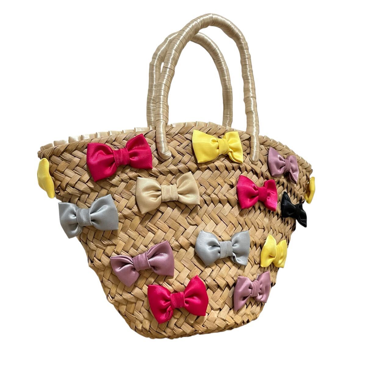 - ※M 【ほぼ未使用】CROLLA クローラ カゴバッグ ストローバッグ ハンドバッグ ベージュ リボン マルチカラー 麦わら