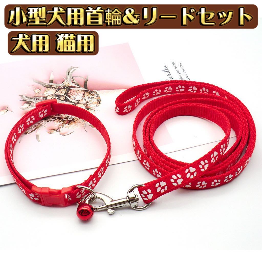 - 首輪リード ハーネスリード 2点セット ペット用品 ペットグッズ 犬用 イヌ ドッグ 猫用 小型犬 足跡柄 おしゃれ レッド