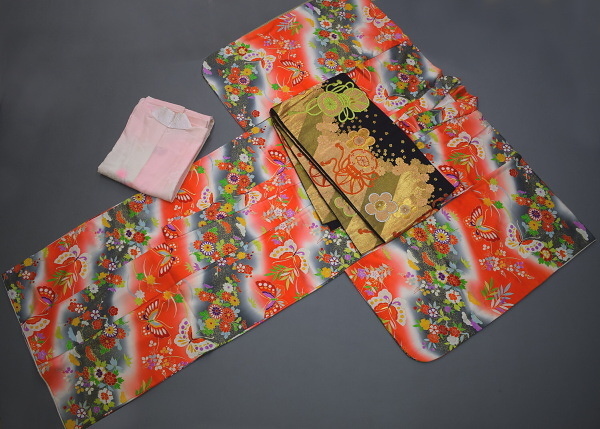 > A06-1【凛々】即決 中古品 正絹 女児 大四ツ身 着物 朱 グレー 蝶 花 帯 長襦袢付