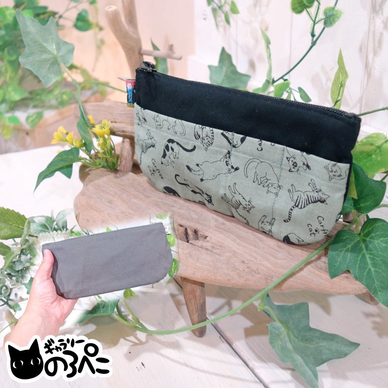 > のんびり猫ちゃんの外ポケット付きペンケース(猫柄コットンオックスとブラックデニムの横長ポーチ) aa362-284