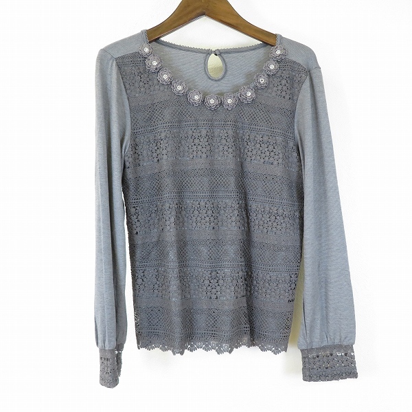 - #a インゲボルグ INGEBORG カットソー 3 グレー レース お花 パールビーズ ラインストーン 切り替え 長袖 日本製 962947 k01