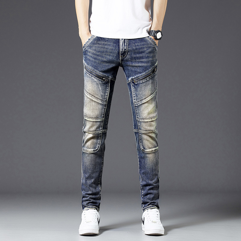 > 上質新作メンズバイクパンツデニムパンツジーンズカジュアルGパンスキニーパンツストレッチダメージオートバイブルーw28~w38サイズ選択可