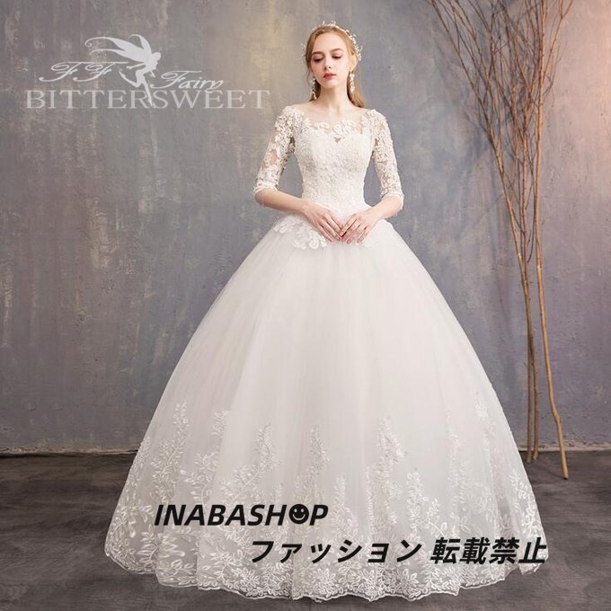 > ウェディングドレス 五分袖 ウエディングドレス 床付きタイプ Aライン ロング 前撮り 後撮り 披露宴 結婚式 演奏会 発表会 海外挙式ドレス