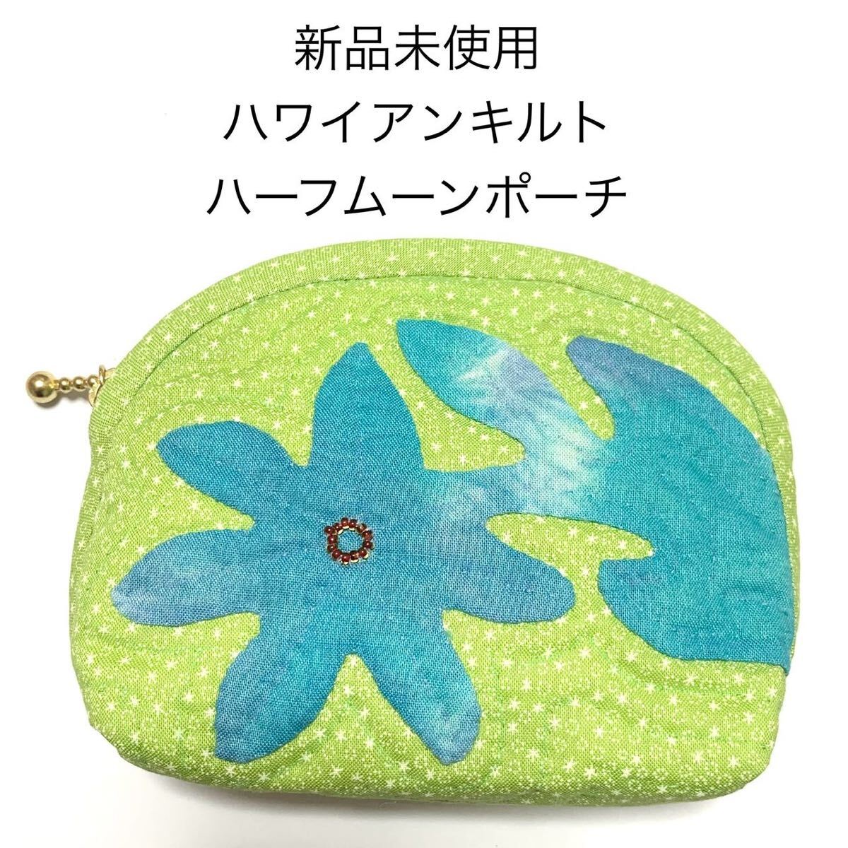 - 新品未使用 ハワイアンキルトコットンポーチ ライムグリーン ブルー 青 黄緑 マルチポーチ ハーフムーン フラワーシルエット 花柄 小物入れ