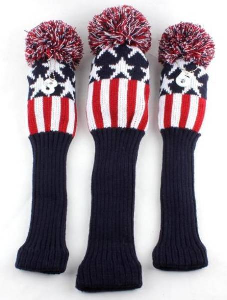 > 星条旗 ニット製 ヘッドカバー ドライバー FW UT対応 3枚 番手タグ付 ホワイト/レッド 1セット