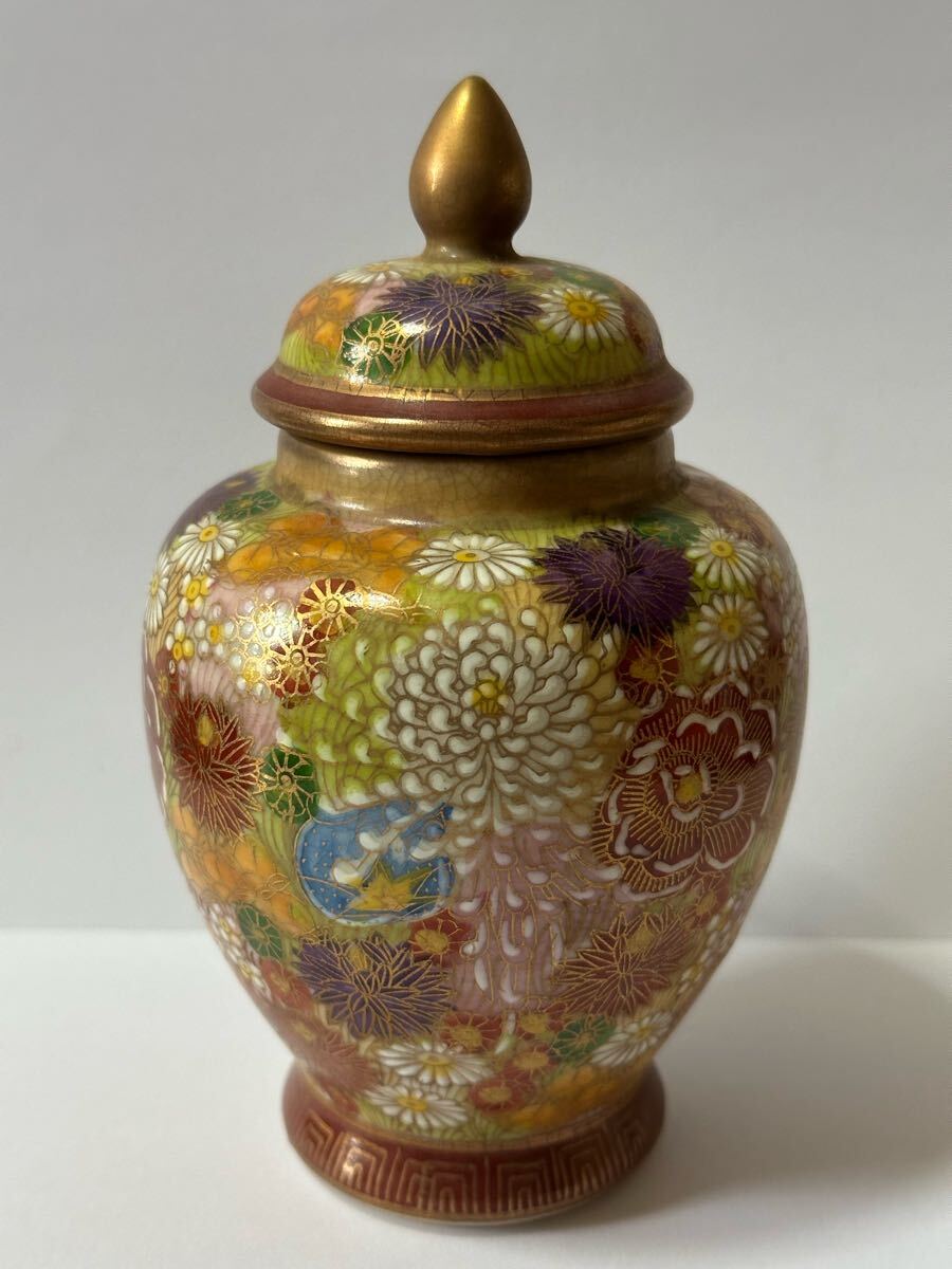 - 九谷焼 金彩色絵 花詰 蓋付き 小壺