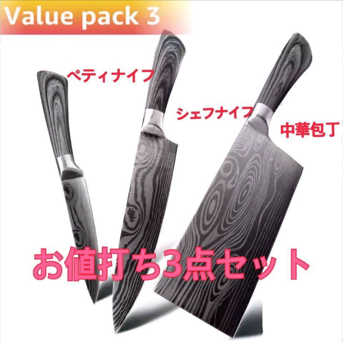 > お値打ち3点セット シェフナイフ&ペティナイフ&中華包丁 高炭素ステンレス鋼使用 業務用にも 切れ味抜群 簡単お手入れ