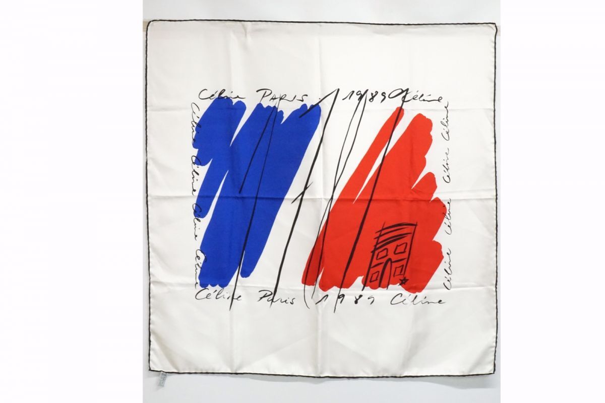 - セリーヌ 1989 大判 スカーフ 凱旋門 トリコロール シルク100% ストール ショール 白 ホワイト CELINE 3319k