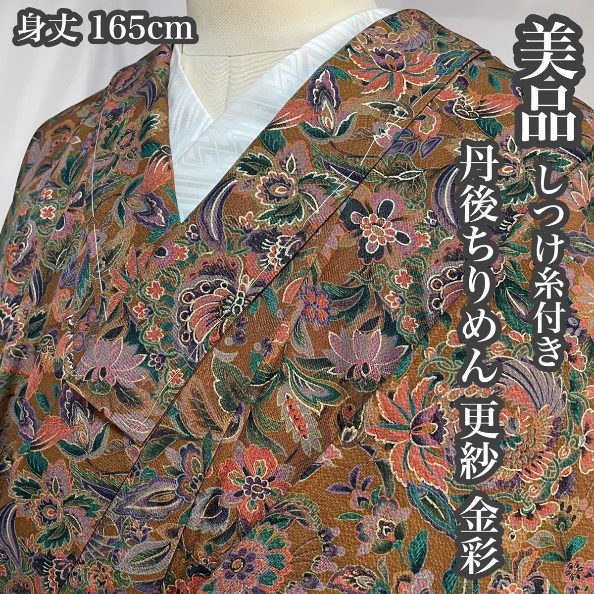 > #H854 美品 しつけ糸付き 丹後ちりめん 縮緬 更紗 鳳凰 型染め 金彩加工 正絹 身丈165cm 和装 和服 着物【wellriver】