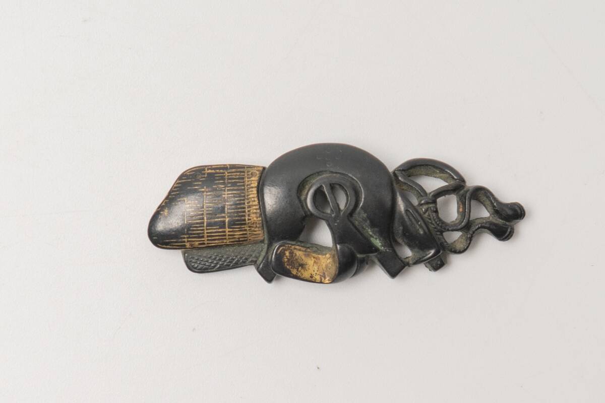 地金は赤銅地と思われ、落ち着いた黒味のある地に、金加工を施した上質な仕立てとなっております。