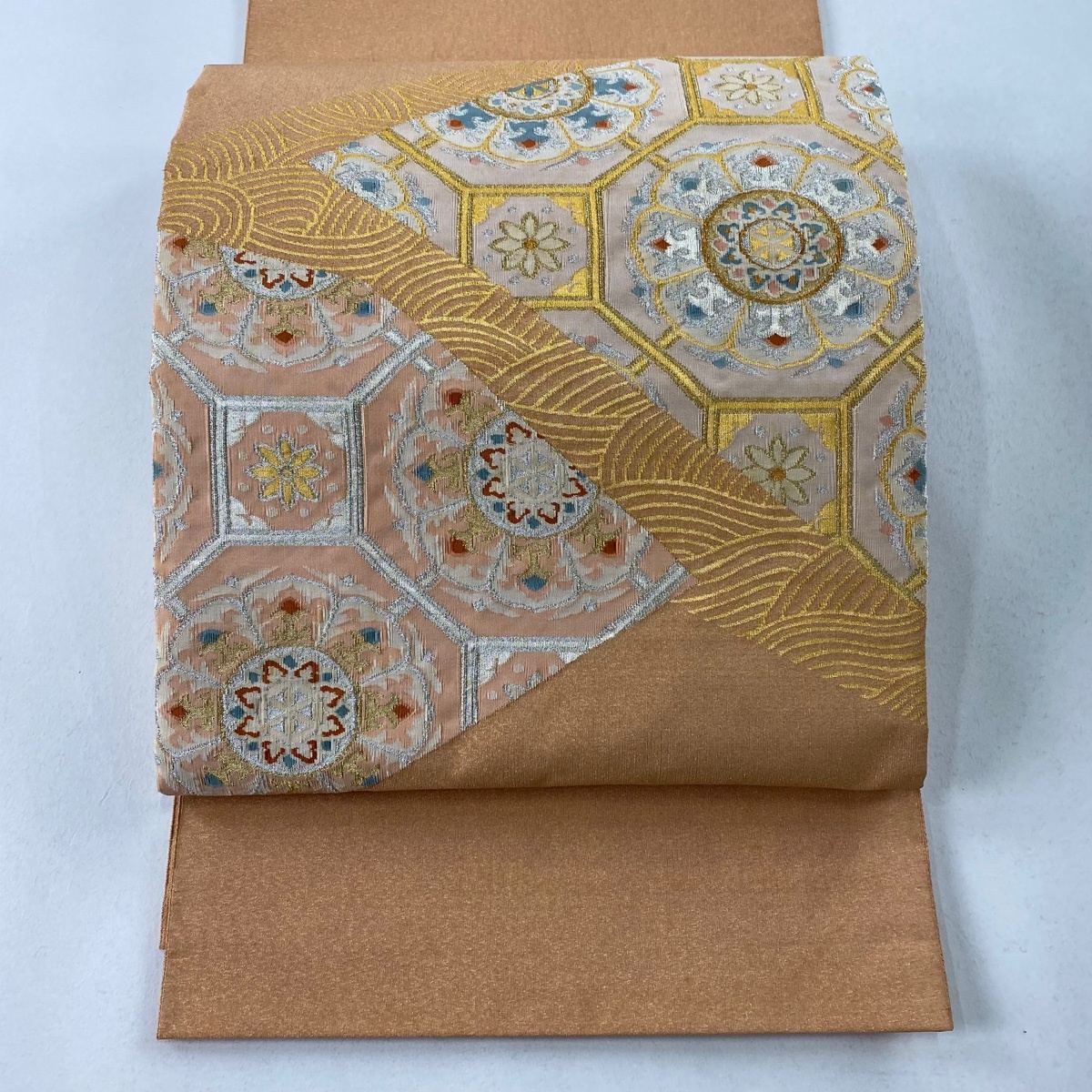 - 袋帯 秀品 蜀江華文 波 金銀糸 箔 オレンジ お太鼓柄 正絹 【中古】
