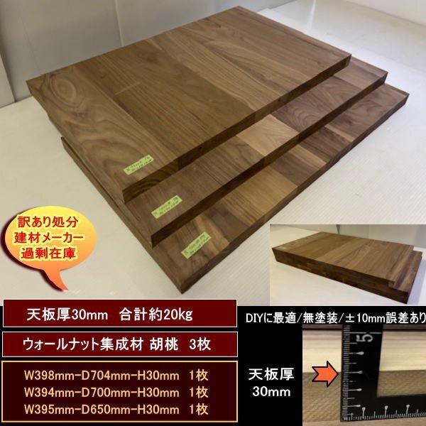 > ウォールナット集成材 胡桃 くるみ 高級材 端材 3点セット 約20kg 無塗装 天板厚30mm 398-704-30mm 他2 送料無料 訳あり処分
