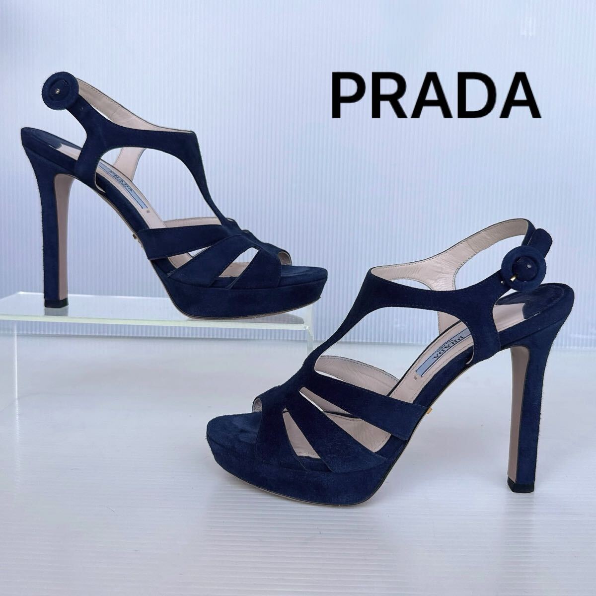 - PRADA プラダ ストラップ付き ベルト ハイヒール ピンヒール パンプス サンダル オープントゥ 極美品 レーディス 靴 35 シューズ ネイビー