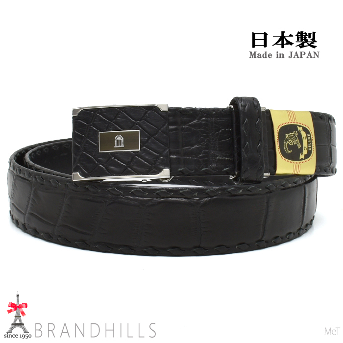 > クロコダイル ベルト メンズ ブラック ステッチ マット加工 紳士用 黒 幅35ミリ スライド式バックル 裏:牛革 日本製 新品