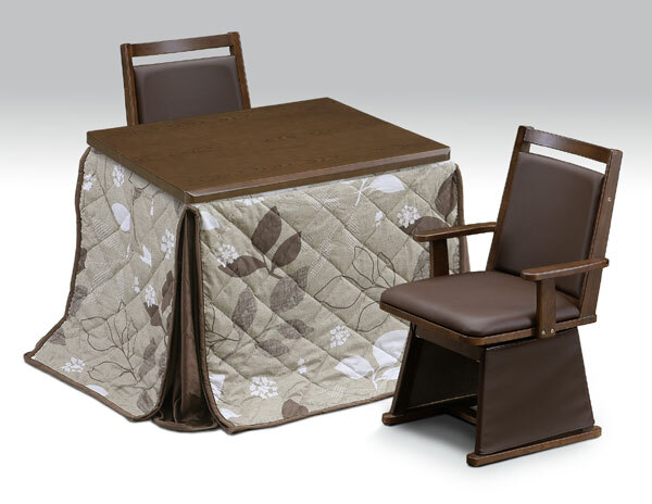 - ハイタイプ高脚/ダイニングコタツ こたつ90×75センチ幅(長方形)+肘付椅子2脚+植物柄布団の4点セット ブラウン色