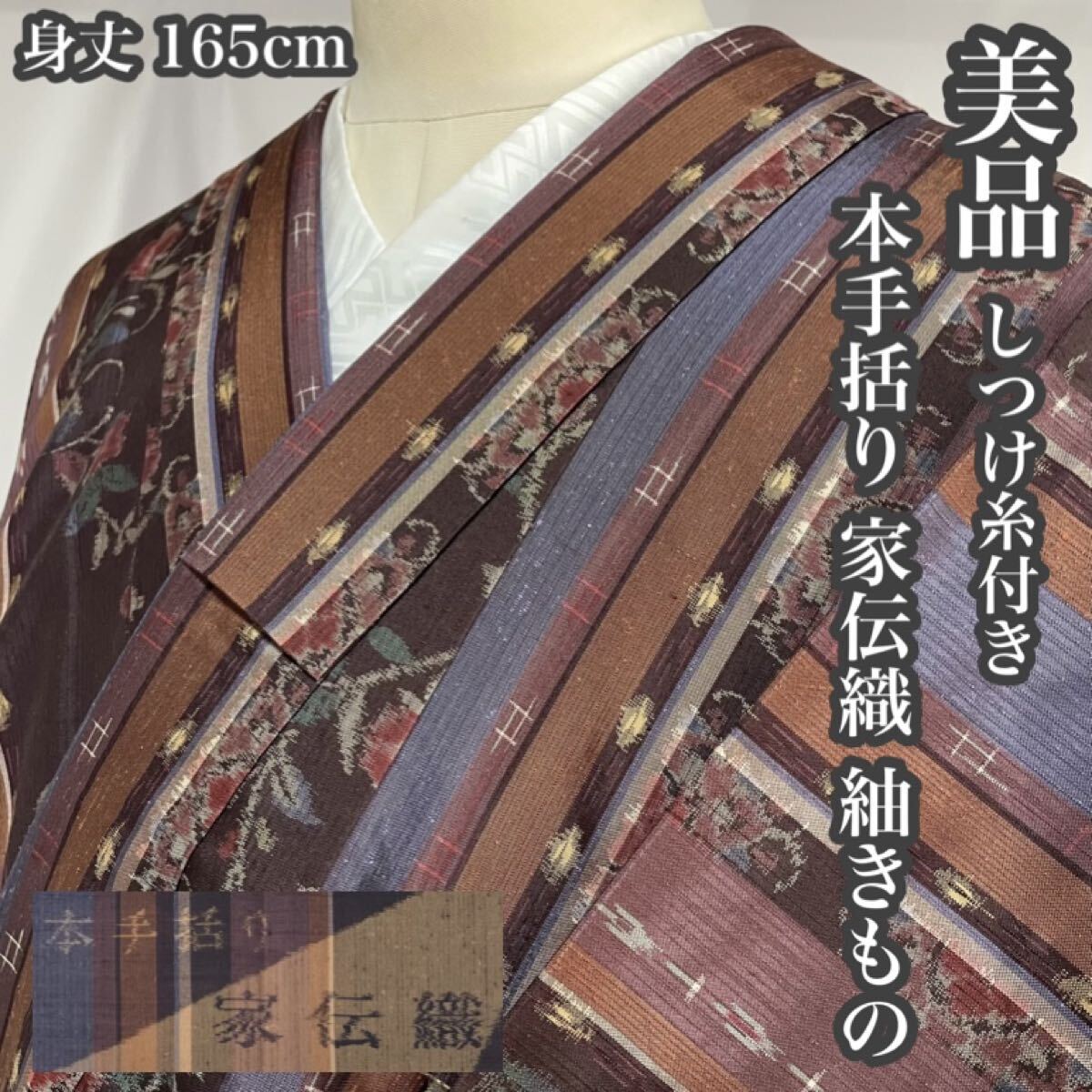 > #H879 大きめサイズ 美品 しつけ糸付き 本手括り「家伝織」紬きもの 花唐草 縦縞 正絹 身丈165cm 和装 和服 着物【wellriver】