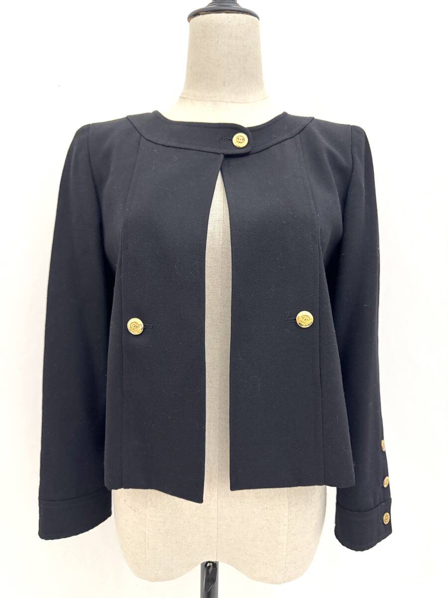 - 7H2408【本物保証】シャネル ノーカラー ジャケット ブラック ココマーク ボタン ゴールド 38 vintage CHANEL