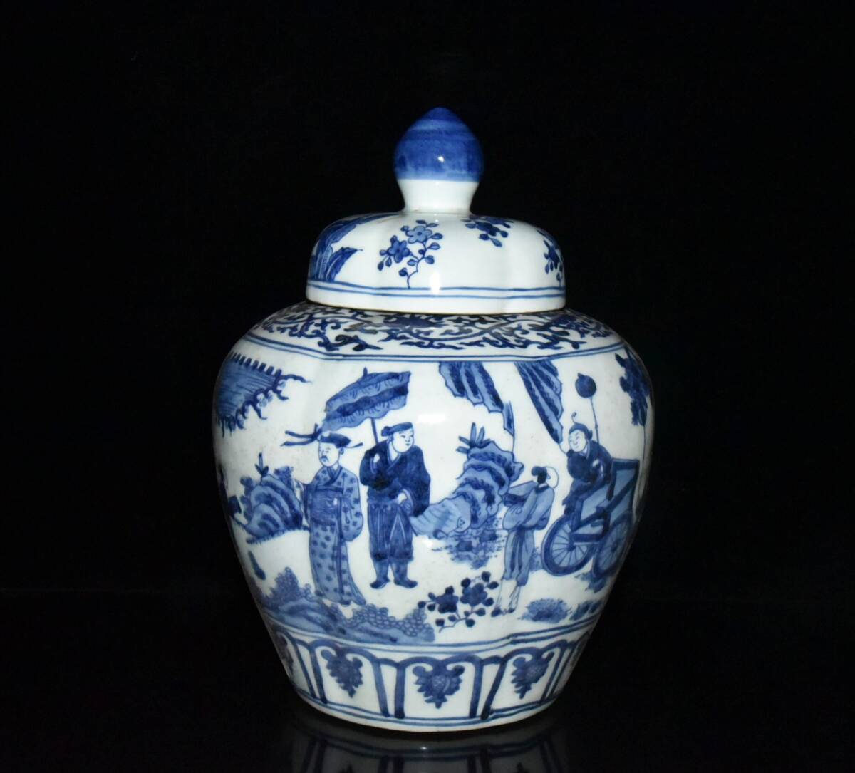 > 【超珍館蔵】明 嘉靖年製款 古陶瓷品 青花 捏花 人物故事紋 蓋罐 陶藝 古賞物 古董品 古美術品 時代物 旧家蔵出 稀少珍蔵品