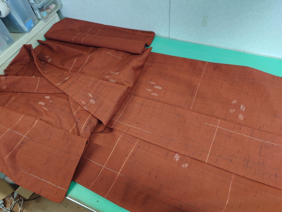 > ●146 レトロ モダン 粋な 紬 絣 模様 オシャレ 赤 煉瓦色 アンティーク 着物 未使用品? 美品 ①