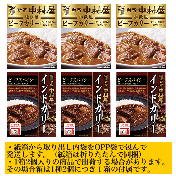 - ■新宿中村屋 純欧風ビーフカリー(金箱)・インドカリー(ビーフスパイシー) 2種6箱■