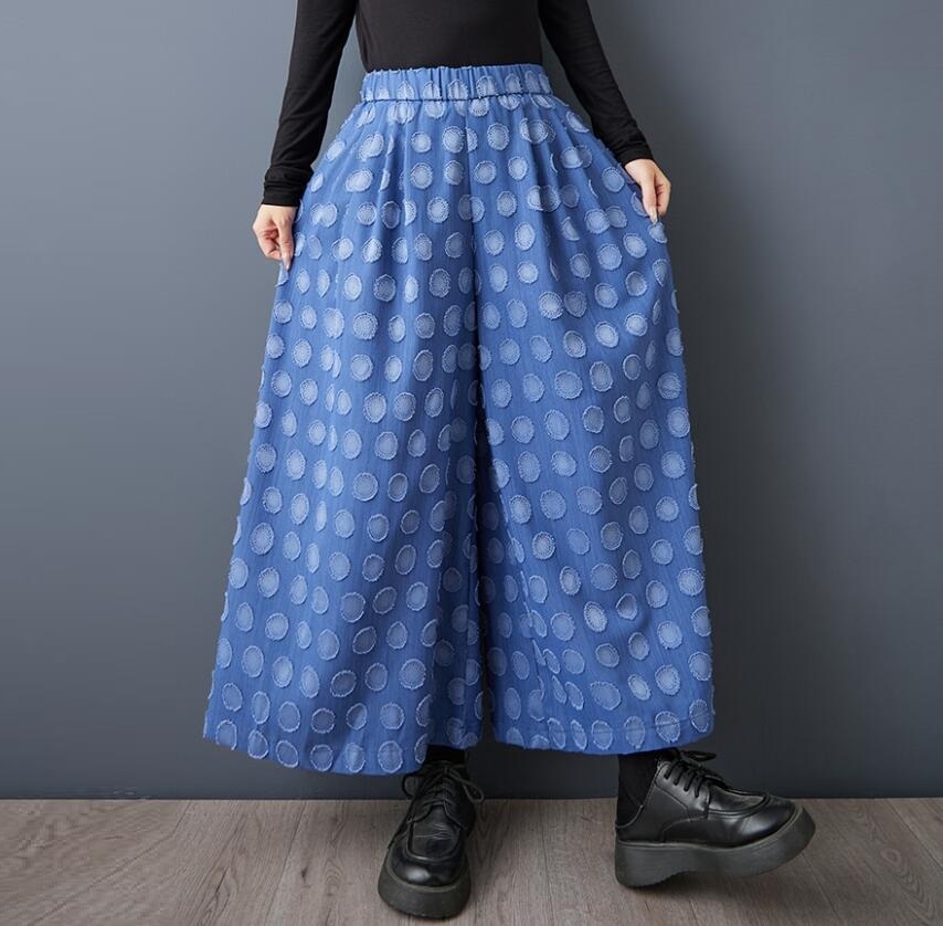 - 新入荷*デニムワイドパンツ レディース デニムパンツ ボトムス 大きいサイズ ゆったり カジュアル ドット柄 ライトデニム