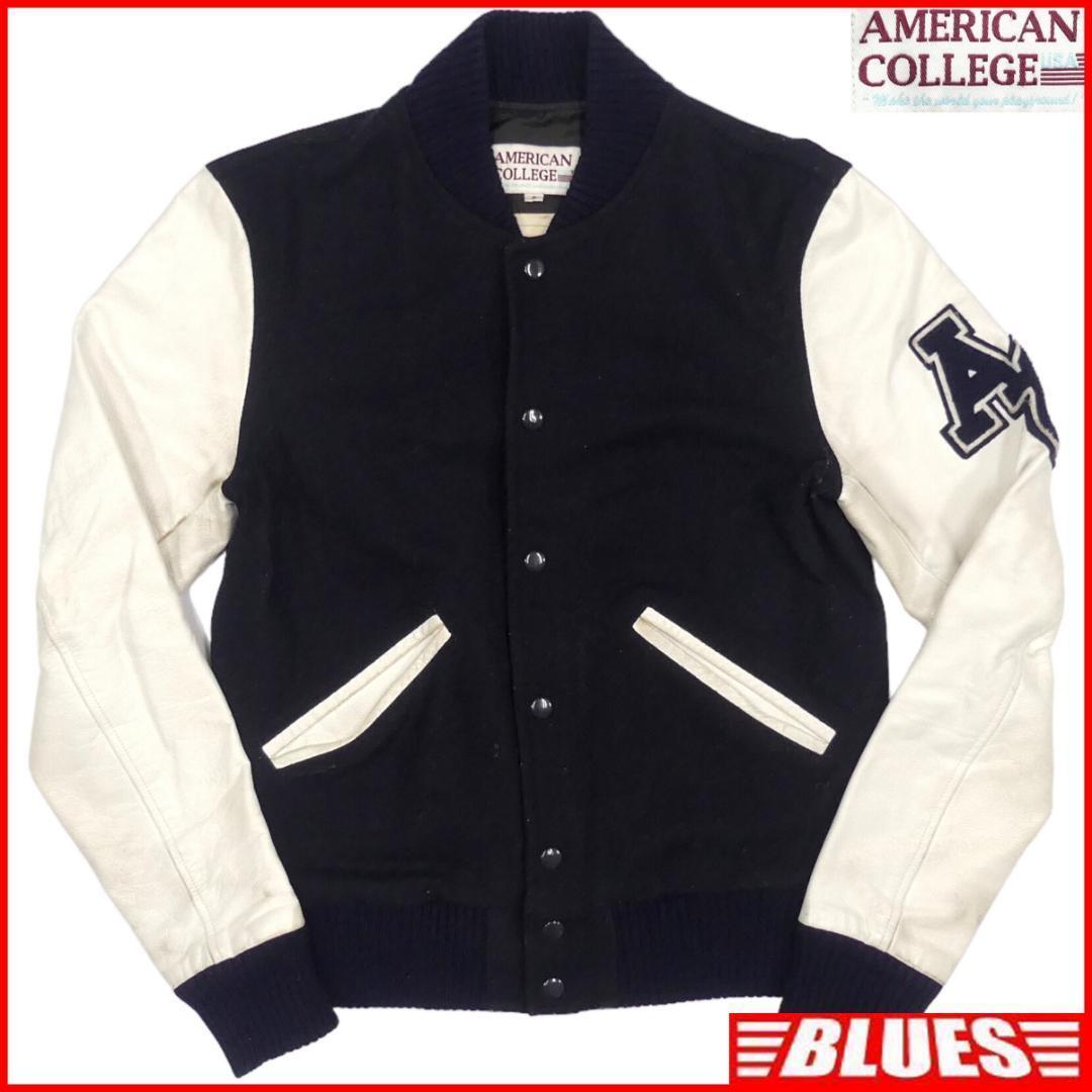 - 即決★AMERICAN COLLEGE★メンズS レザーアームスタジャン アメリカンカレッジ 黒 白 本革 ブルゾン 本皮 ジャンパー 革ジャン