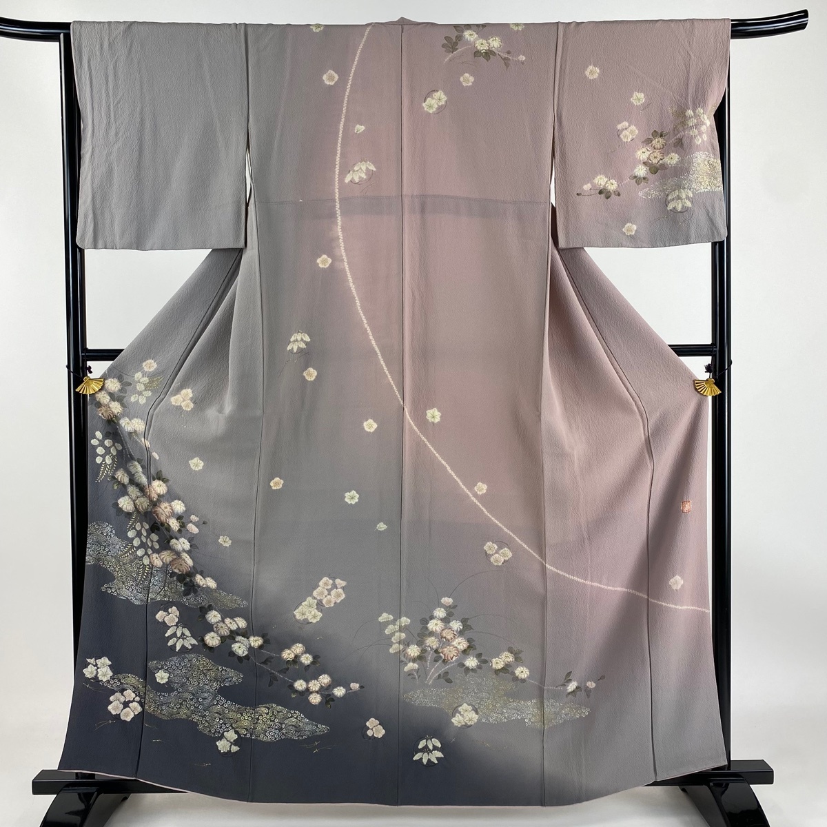 - 訪問着 身丈160.5cm 裄丈65cm M 袷 滝泰 落款 草花 霞 金銀彩 絞り 灰色 正絹 名品 【中古】