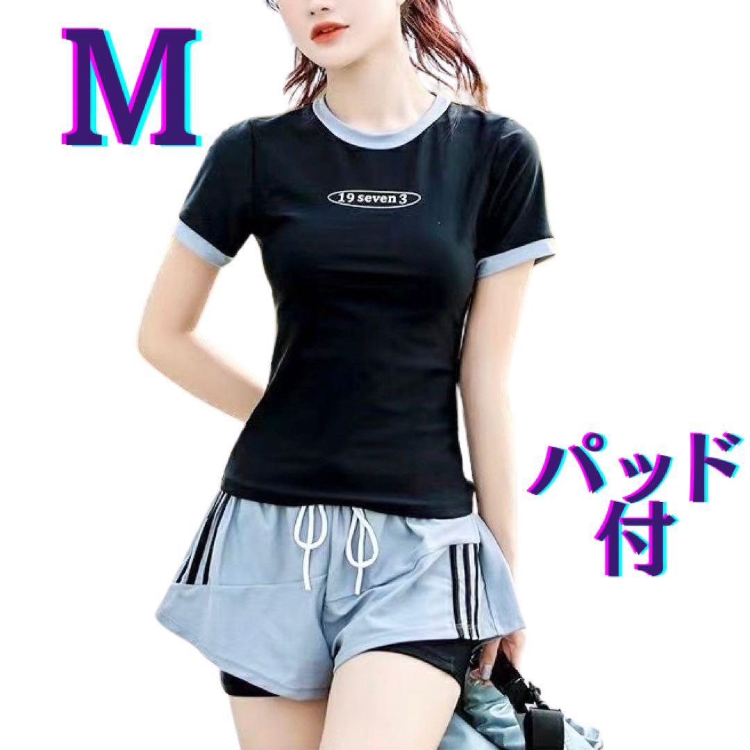 - M 上下2点セット 水着レディース 体型カバー 半袖ラッシュガード フィットネス ショートパンツ 黒グレーUV 水陸両用 速乾無地スポーティー