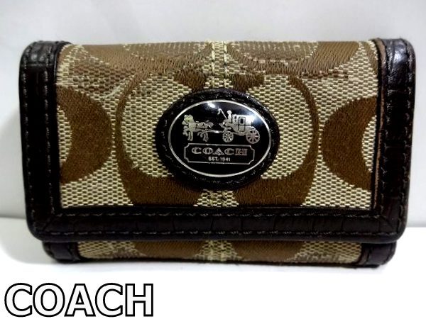 > X5H086◆本物◆ コーチ COACH ブラウン系 本革レザー×シグネチャー 6連 キーケース