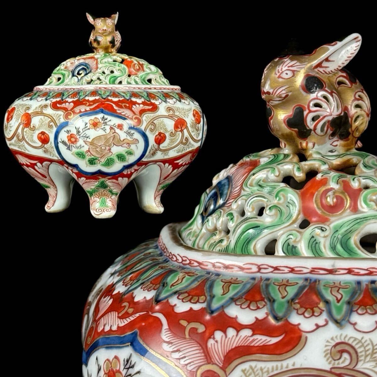 - 日本美術 九谷焼 錦手 赤絵 金彩 兎文 四足 香炉 窓絵 草花図 香道具 時代品 元箱 【2b08198 5】