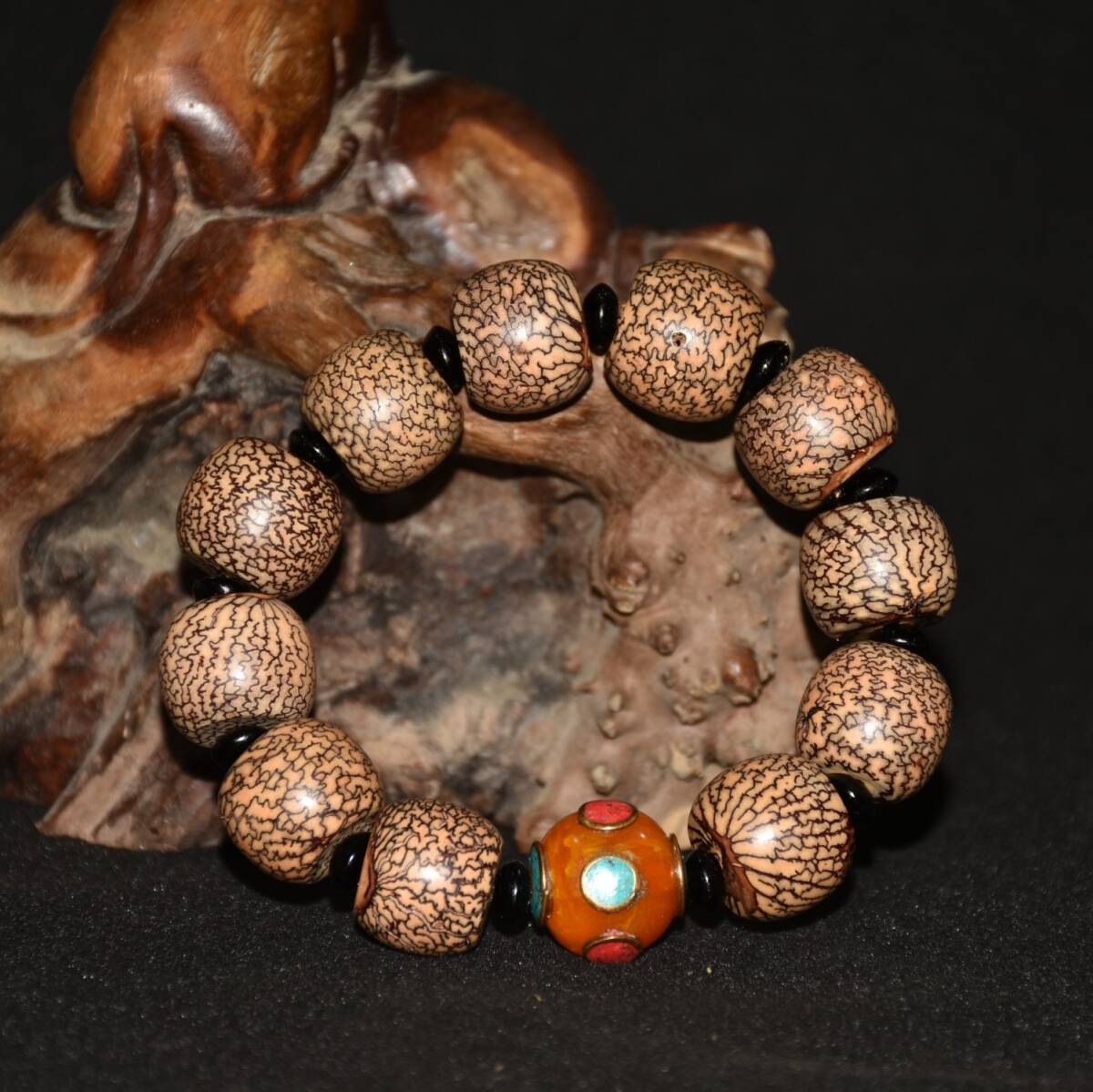 > 8+GV7386「東洋美術」 中国骨董 人間国宝 【蜜蝋象嵌の宝石ブレスレット付き菩提樹】 旧物 孤品 珍品 収蔵価値が高い
