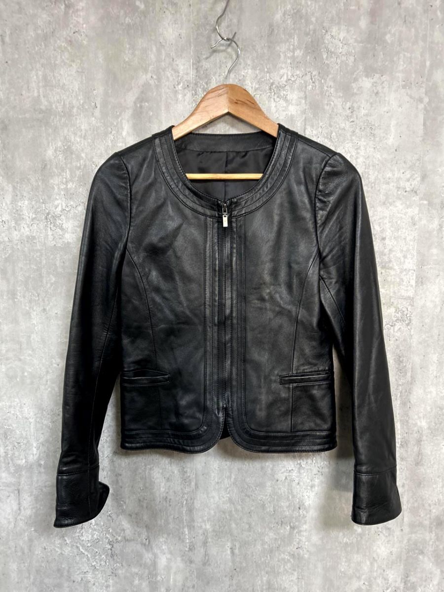 > fabric made italy イタリア製 羊皮 本革 レザー ノーカラー ジャケット sizeM/黒 ◆■◎ レディース