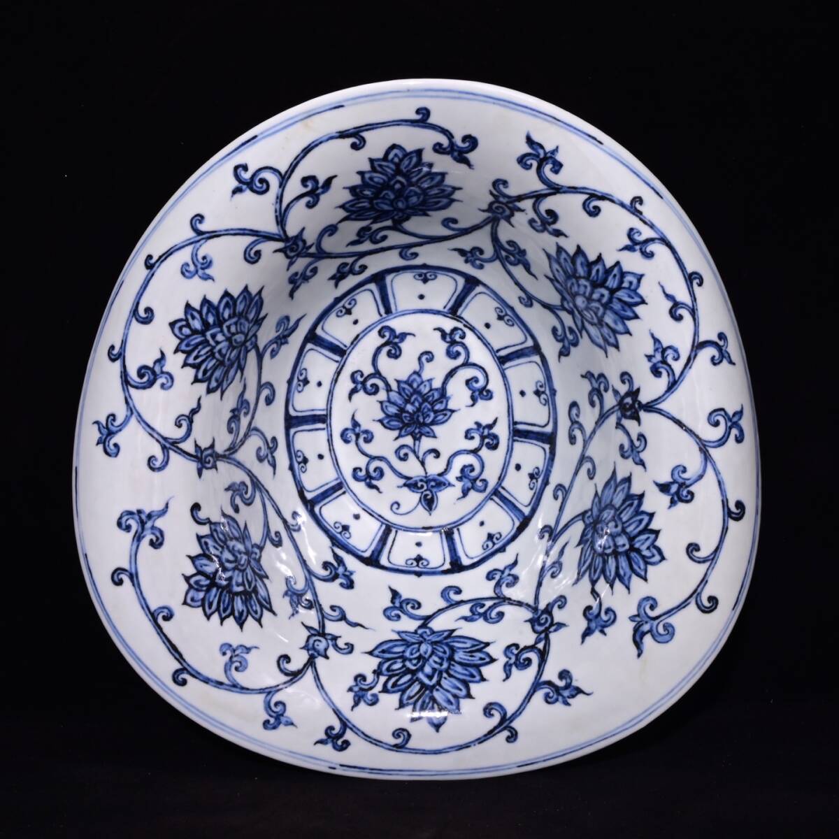 - 8+GV7389「東洋美術」 中国骨董 人間国宝 磁器製品【青と白の渦巻き花模様の洗面台】 旧物 孤品 珍品 陶磁器 収蔵価値が高い