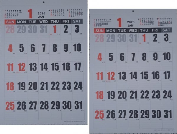 - 【2冊:大判 特大 大きい カレンダー:A2:60x42cm】★大文字:白黒 :特大文字★2026年:メモできる:令和8年:壁掛け:暦:12面★No1