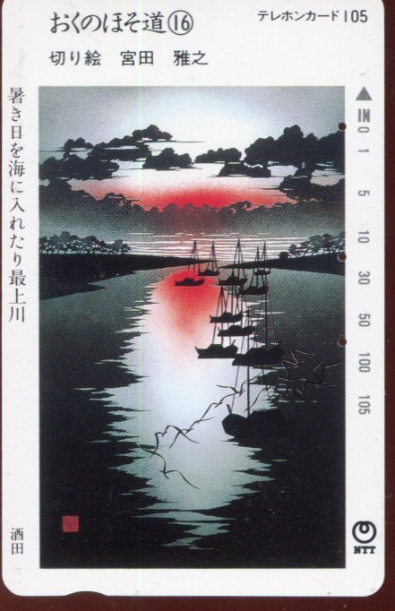 - 《テレカ》1988年 奥の細道(16) 暑き日を海に入れたり最上川(酒田) 切り絵:宮田雅之(105度)=使用済