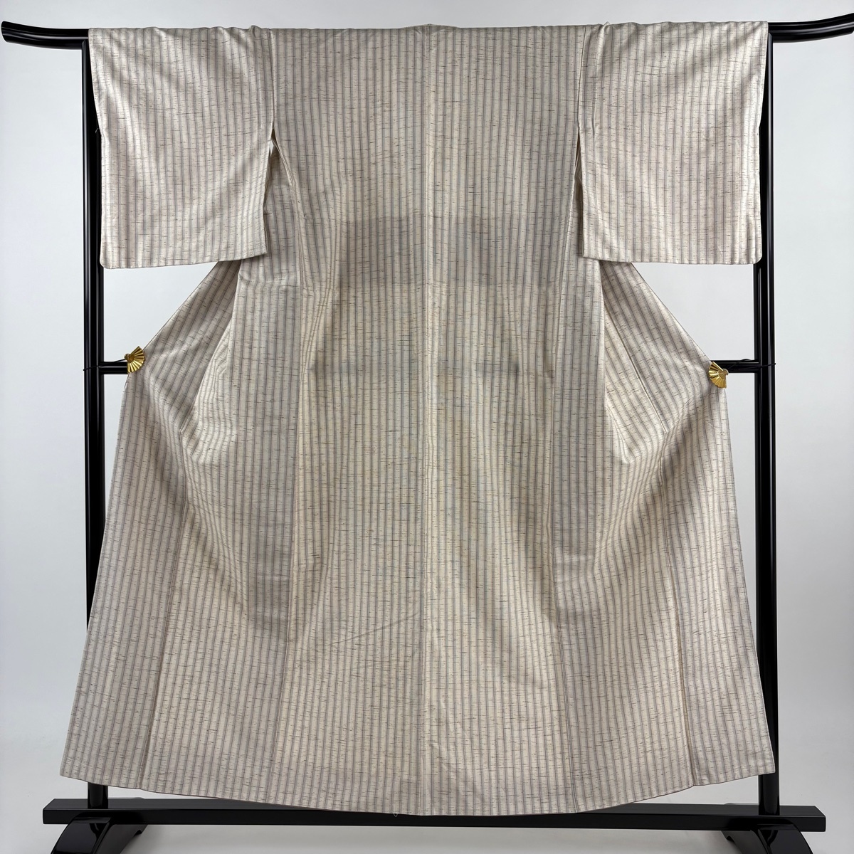 - 紬 身丈154.5cm 裄丈66cm M 袷 縦縞 ベージュ 正絹 名品 【中古】
