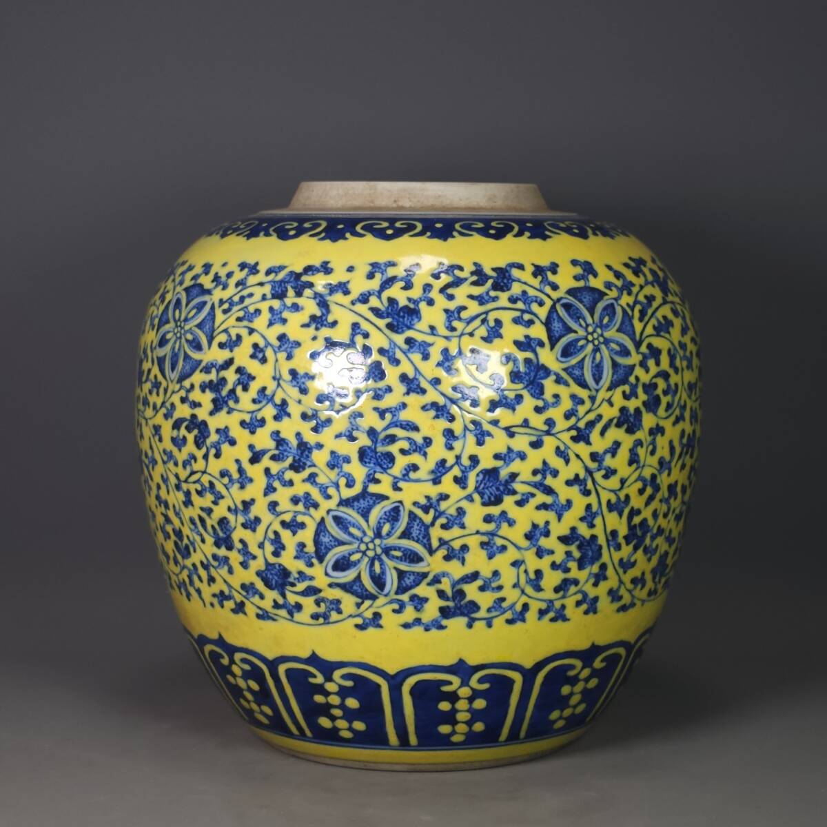 - 8+GV7464「東洋美術」 中国骨董 人間国宝 磁器製品【清朝康熙年間の黄釉蓮花壺】 旧物 孤品 珍品 陶磁器 収蔵価値が高い