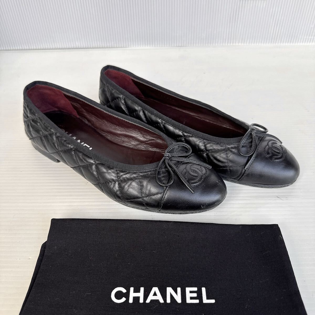 - CHANEL シャネル 定番 ココマーク リボン バレリーナ フラットシューズ パンプス ミュール 美品 レーディス シューズ 靴 36.5 黒 レザー