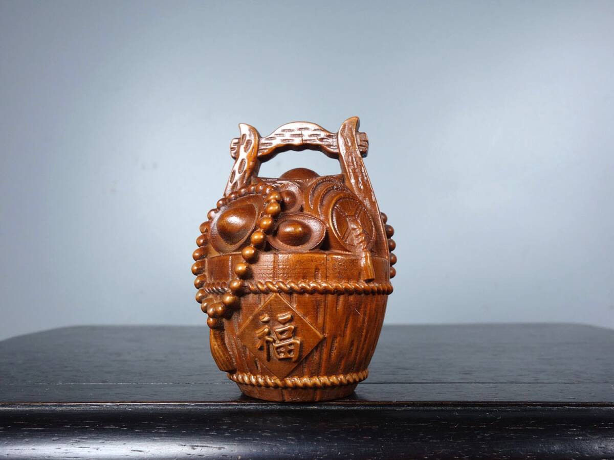 - 『館蔵珍品 黄楊木製 細密彫 一桶金 置物 賞物』稀少珍蔵品 古賞物 貴重物品 収蔵品 中国古美術 時代物 古董品