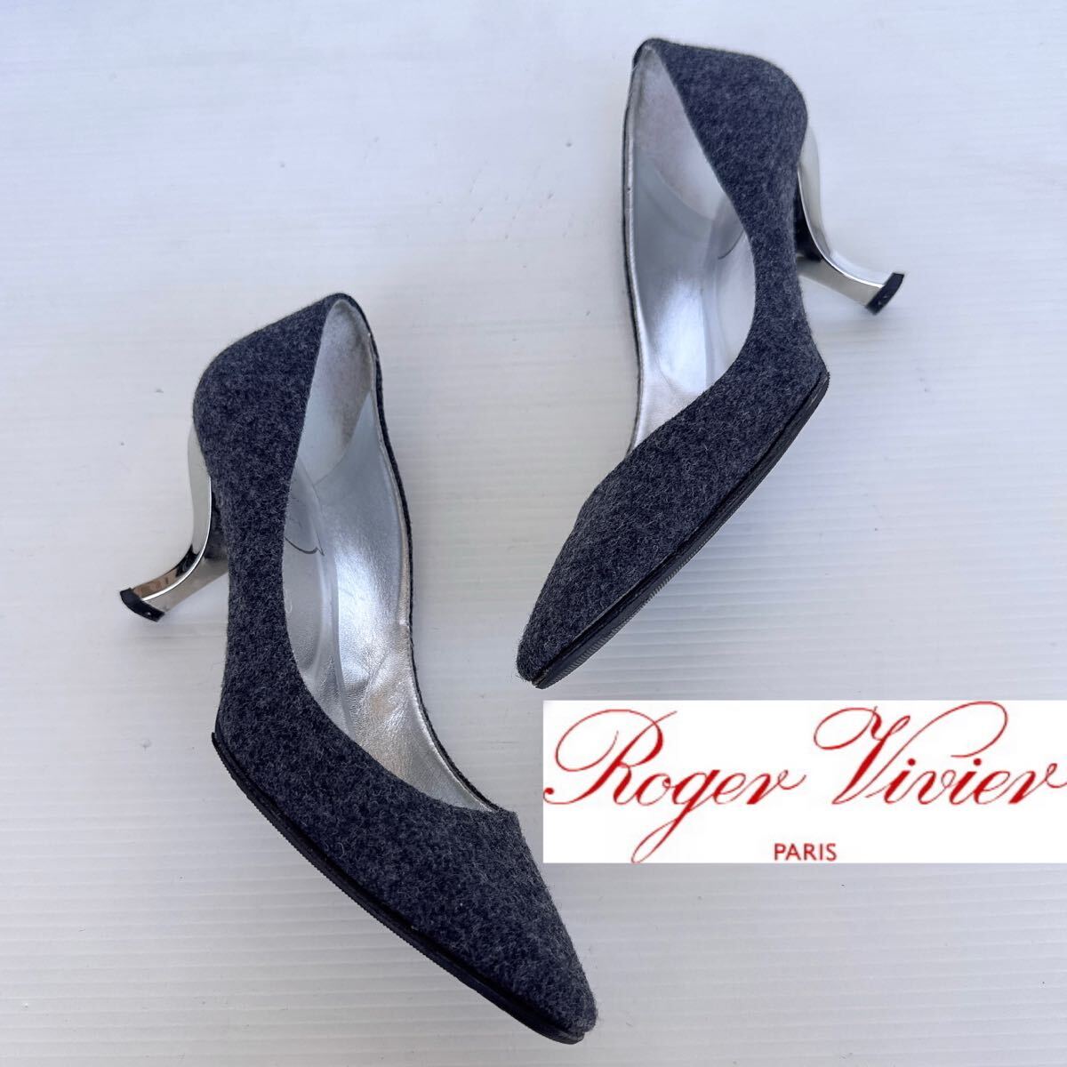 - ROGER VIVIER ロジェヴィヴィエ メタルピンヒール ポインテッドトゥ パンプス フラットシューズ サンダル 35 レーディス 靴 グレー