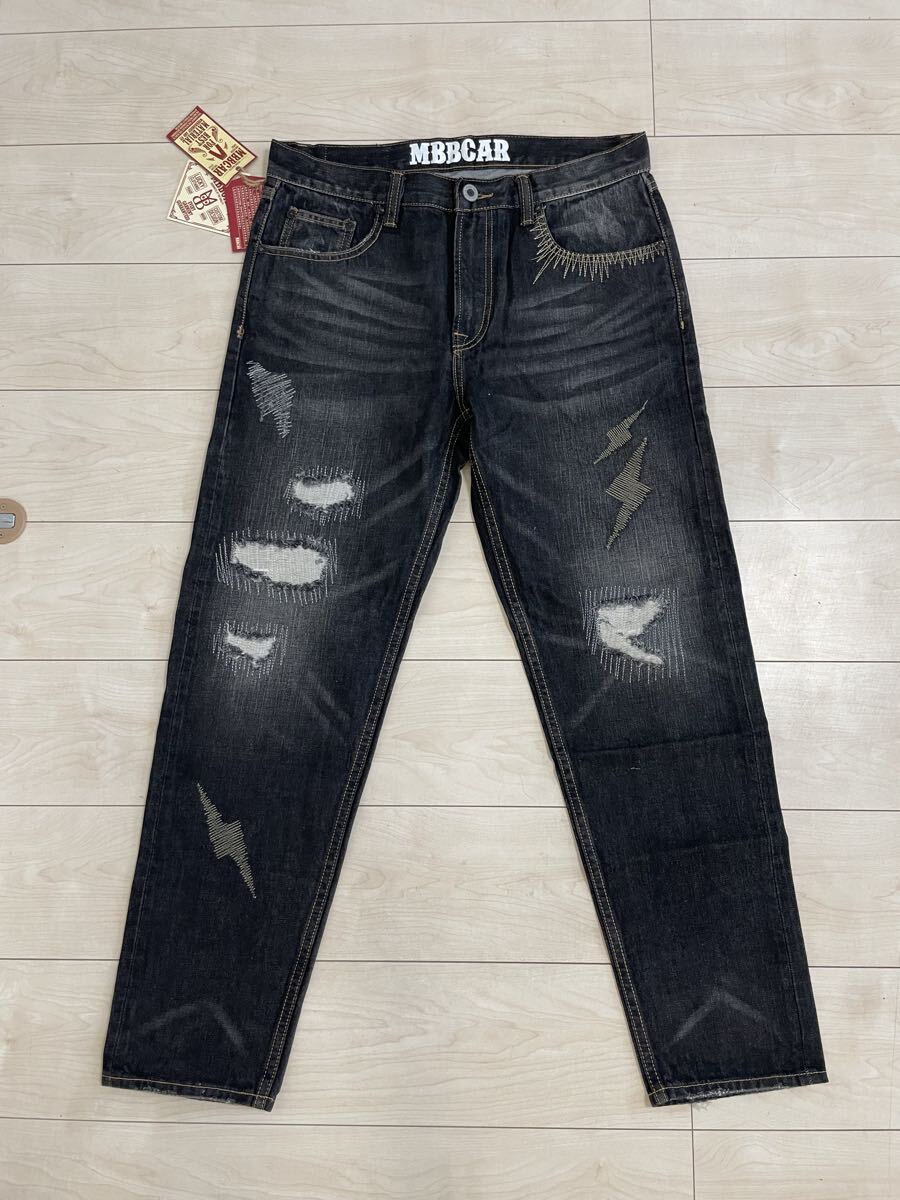 - 新品未使用 MBBCAR ストレート デニム W34 ダメージ加工 ジーンズ 送料安 かっこいい