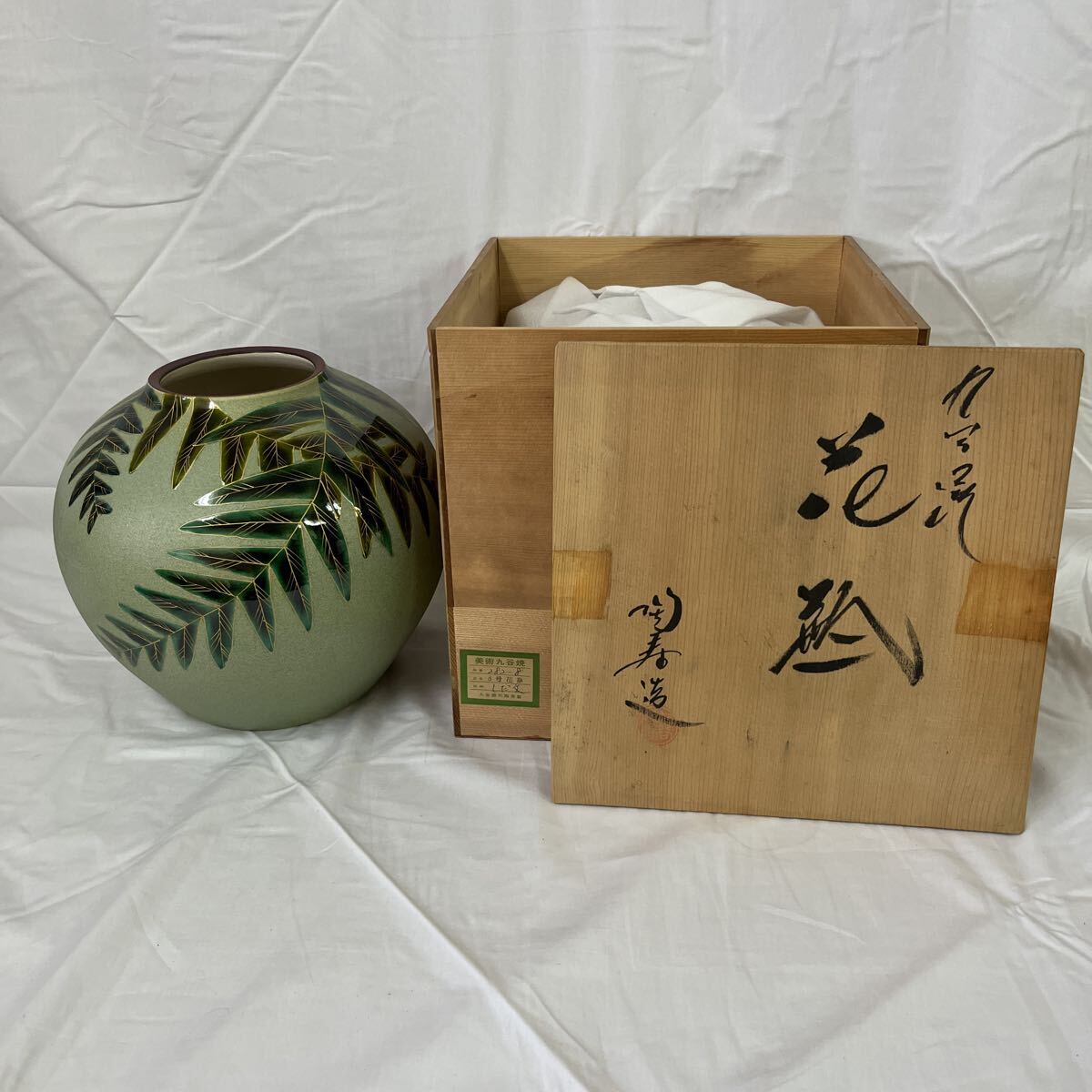 - 839 九谷焼 しだ文 8号花瓶 花器 壺 陶器 木箱付 最終値下げ出品